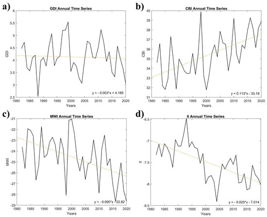 Regionally averaged annual trends for the GDI and each sub-index were calculated, shown in Figure 7, with p-values listed in Table 4. Results show the GDI is slightly decreasing over time, while the CBI, MWI, and II are gaining intensity. For example, the annual CBI trend shows an increase, thus reflecting an increase in heat and moisture in the region. However, the MWI and II are also intensifying. Since these are dampening factors, they are represented with negative values. Therefore, these sub-indices becoming more negative represent an intensification of their effects, i.e., a potentially more stable atmosphere and hostile to development. For annual trends, only the CBI, MWI, and II were determined to be statistically significant.