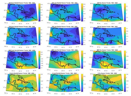 A decreasing trend in GDI (convection potential) suggests lower potential for deep convection. This is observed to a large extent in the case of ERS and DS when examining the spatial distribution of trends illustrated in Figure 8. This is particularly true for the eastern Caribbean and the Gulf of Mexico in the ERS and DS, and for the Lesser Antilles, northern South America, and northwest Caribbean/Bahamas during the DS. This is demonstrated at the local scale by Mote et al. [52], who report the link between anomalously low GDI values and reduced ERS rainfall during a 2015 drought event in Puerto Rico. Additionally, the Climate Studies Group Mona [51] report increases in the number of consecutive dry days between rainfall events, the amount of rainfall that occurs during a rainfall event, monthly maximum 1-day rainfall amount, and monthly maximum consecutive 5-day rainfall amounts for the region on average. Although the regional trends in CBI (heat and moisture) show an increase, the MWI and II are also increasing in magnitude (they are becoming more negative). This suggests that the dampening factors are dominating the effect of the increasing heat and moisture conditions.