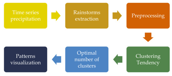The methodology that was applied in the study is presented in Figure 1 in the form of a flowchart. Precipitation data with a time step of 30 min were imported; rainstorms were extracted from the dataset and preprocessed in order to have an appropriate form as input to clustering analysis. A cluster tendency assessment was applied, so as to examine if clustering is meaningful, and the optimal number of clusters were determined by a custom method that utilizes fuzzy c-means. Additionally, the Huff’s curves were compiled for the same dataset. The resulted patterns were visualized using a nonlinear projection of the data in two dimensions, and finally, their characteristics were examined in terms of internal and seasonal structure.