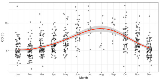Red represents the monthly sinusoidal model of CD (Equation (11)). The grey area corresponds to the standard error of the model using linear regression. The grey dots represent the monthly CD values per station, as computed from Algorithm 1.