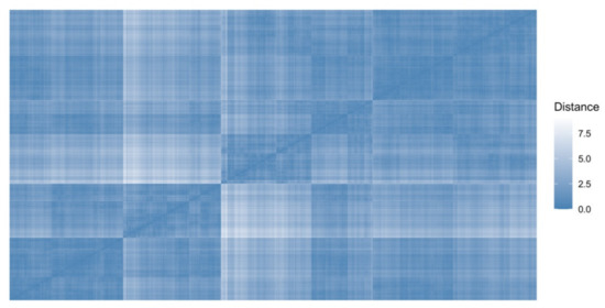 The VAT method creates an image matrix that can be used to visually assess the cluster tendency. In the method, as it was applied, the pairwise dissimilarity values of the rainstorms were computed, and these values were reordered in the form of a matrix and displayed as an intensity image. In this image, the clusters are indicated as dark blocks of pixels along the diagonal [46]. As a dissimilarity measure, the Euclidean distance was used