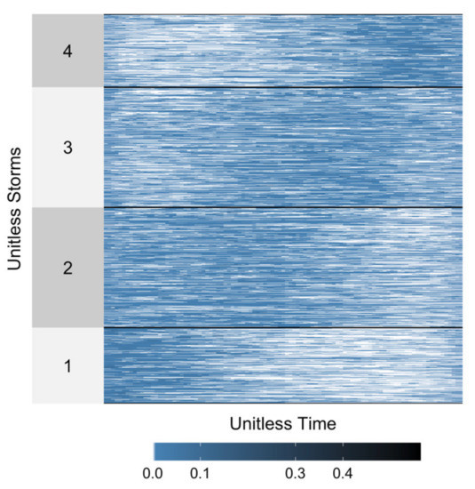 Unitless rainstorms values re-order by clustering results. The names of the clusters were used in order to match with Huff’s classification. White symbolizes zero precipitation depth, and different blues depict the presence of unitless precipitation.