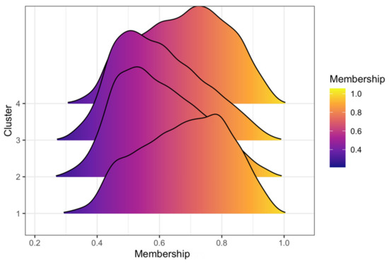 In the sequel (Figure 9), the cumulative values of the centers of the four clusters are compared to the ones calculated using Huff’s method of classification that is based on the quartile with the highest intensity. The two methods produce different results, while fuzzy clustering creates unitless cumulative curves that do not overlap. The four Huff curves were also tested, for all possible pairs, whether or not are drawn from the same distribution using the Kolmogorov–Smirnov test and three pairs failed to reject that hypothesis for both significance levels a = 5% and a = 10%.