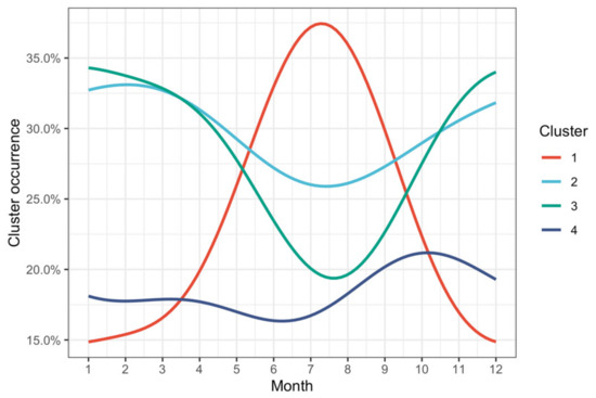Cluster number one has notably higher variance and maximum occurrence during spring and summer months that match convective activity over Greece (Figure 7). Clusters two and three have distributions similar to each other and inverse to the first one, related to the prevailing winter weather systems, having their minima during summer. Cluster four has a more uniform distribution with the exception of winter months, when it has its maximum. The latter cluster, with its relatively higher intensity values and, also, higher ratio of occurrence during the wetter winter months in Greece, can be utilized in hydrologic design in the construction of design storms.
