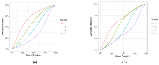 A different family of models are the profile-based ones [10,11] that utilize the internal structure of rainstorms in their entirety and not as derived parameters of statistical distributions. These rainfall models employ the construction of Huff or mass curves [12], a probabilistic method for sub-daily precipitation records, in which rainstorm data are represented in the form of normalized time, versus normalized cumulative precipitation depth and classified by the quartile where the maximum intensity occurs. The use of mass curves offers several advantages: (a) adequate stability regarding the sample size of rainstorms [13]; (b) coarser hourly data giving nearly identical results to data with finer time-step in the order of minutes [13]; (c) similarity in very long distances [12,13,14]; (d) the fact that they are not affected by elevation, type of storm, storm duration or storm precipitation depth [15].