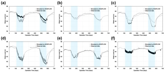 Figure 5 shows six different groundwater level decline–recovery curves, which compare the simulation results obtained from the six observation wells. The gray line in this figure indicates the groundwater level based on actual well measurements, and the black line indicates the precise modeling results using MODFLOW. The blue box represents the WCC pumping periods. The six graphs were based on the values of the six observation wells of CWW-04, CWW-05, CWW-07, CWW-08, CWW-11, and OB-11 in the bank, used in the model calibration. When the WCC began, the pattern of the groundwater level decline exhibited an abrupt change (increased slope) at the early stage. As the slope decreased, the rate of change of the downward trend gradually decreased. When WCC ended, the water level recovered for 3–4 months. Examining the graphs in detail, the periods could be divided into the following parts: (a) changes in aquifer groundwater levels owing to rainfall in the summer, (b) groundwater decline owing to WCC for four months between 2012 and 2013, (c) aquifer water level recovery, groundwater level fluctuations owing to precipitation during the summer in 2013, (d) the re-decline of groundwater level owing to WCC, which started in November 2013, and (e) the re-recovery of groundwater level owing to precipitation during the summer in 2014. The examination of each observation well showed that the groundwater level, which ranged from 63 to 68 m in steady state, declined after the operation of the water pumping well. As the well was farther in the northeast region, which is inland of the river’s downstream, the clustering of the pumping wells was denser. Additionally, as the distance from the river increased, the degree of groundwater declines increased. By contrast, the simulation results showed that in the upstream of the river, a high-water level was maintained because of the river, and an induced recharge in the river resulted in a small water level decline. For example, CWW 8, which is located at a distance farthest from the river, exhibited a large groundwater level decline; however, CWW 11, which was located at a short distance from the river, exhibited a relatively small groundwater decline.