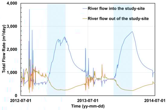 25] considered that when the system enters a new steady state, sustainable development is maintained. At this study site, a groundwater level declines of 2.5 cm in the total area occurred every year. In fact, intense local groundwater depletion occurred at the center of the study site. If the regulation of some areas was enforced with an appropriate optimization method, instead of 20% artificial recharge of the total usage, sustainable development of the total area could be possible if the development amount was reduced to values less than 20% of the usage. Based on these arguments, a follow-up study is required. Furthermore, given that groundwater recharge by river water is a major recharge method for groundwater, a follow-up study that simulates the effect of the river water temperature on aquifers during the winter season should be conducted.
