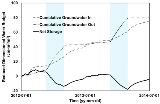 2). Consequently, the groundwater depletion owing to the WCC in the previous year was not recovered by the aquifer recharge over a year, and the storage value at the end of the WCC period for 2013 and 2014 decreased to −18.1 cm-m