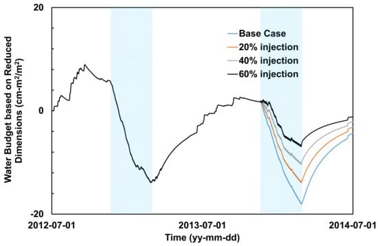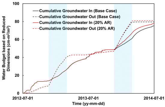 Figure 7). The solid red line and dots indicate the cumulative water budget inflow and outflow amounts that changed when 20% of the freshwater was injected for artificial recharge. When the artificial recharge technique was applied, the amount of cumulative inflow became larger than the existing WCC result, as shown in the red solid line compared to the black solid line in the figure. The change in the slope of the solid line indicates the rapid recovery of groundwater storage in the aquifer, while the dotted line indicates relatively little change in outflow from the aquifer. This means that the groundwater lost from the aquifer during this period was reduced owing to artificial recharge.