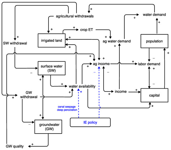 This paper aims to examine the utility of system dynamics modeling by analyzing the costs and benefits of implementing an IE policy. To address the overall effect of IE policy on agriculture sustainability and water sustainability, this study couples the dynamics of the agricultural hydrologic cycle, irrigation management, population, and economic development with interconnected feedbacks through system dynamics modeling. IE policy’s impact is investigated with three climate scenarios through system dynamics simulations within New Mexico’s LRG region from 1969 to 2099. It is hypothesized that system dynamics modeling would provide useful insights for informing IE policy. Specifically, it is hypothesized that unintended consequences of IE policy would be illuminated, such as decreased hydrologic connectivity, groundwater depletion, and negative economic impacts. Simulation results report the model’s pertinent performance measures of irrigated agriculture and local economies in response to the policy scenario.