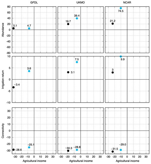 The performance of water abundance, irrigation return, and connectivity are graphed in Figure 3. Black dots represent results during 2017–2050; blue dots represent results during 2051–2099.