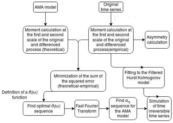 Specifically, this methodology generates time series that preserve irreversibility at two timescales along with the second-order dependence properties of the process. For example, if we choose as the basic scale the one-hour scale, the second scale for the irreversibility to be preserved is two hours. In Figure 1, the complete methodology is shown in steps.