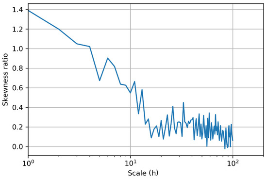 After that, the discrete power spectrum through the Fast Fourier Transform (FFT) and the AMA coefficient were calculated. The next step was to detect the scale-wise time irreversibility. We aggregate the data up to the 100 h scale and calculate the sample skewness of the differenced and original processes. Their ratio is the irreversibility index, as discussed above. Furthermore, the irreversibility of both scales 1 and 2 was also important to calculate since it was to be preserved later by the algorithm.