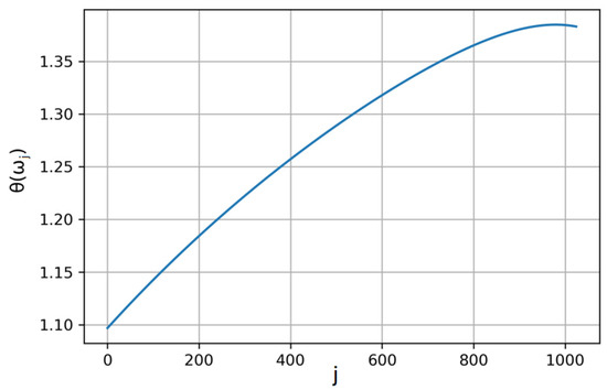 Next, for the preservation of time irreversibility at the second scale, the function needs to be estimated as the smooth minimum of two hyperbolic functions of frequency. The sequence that is found after optimization is shown in Figure 5. It may seem a continuous smooth line, but in reality it comprises 1024 × 2 + 1 coefficients .