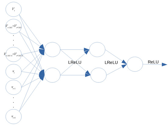 The optimum topology of the network was found to be 2-2-1 (i.e., two hidden layers). This topology, for 14 inputs, introduces 39 parameters, i.e., 34 weights and 5 biases. The activation function for the last layer was ReLU, whereas LReLU was used for the remaining layers [29]. ReLU is ideal for this application, because it not only facilitates the faster training of the network but also ensures the non-negative values for precipitation. LReLU was used for the other two layers to avoid the ’dying ReLU’ problem [29]. The topology of the network is displayed in Figure 1.