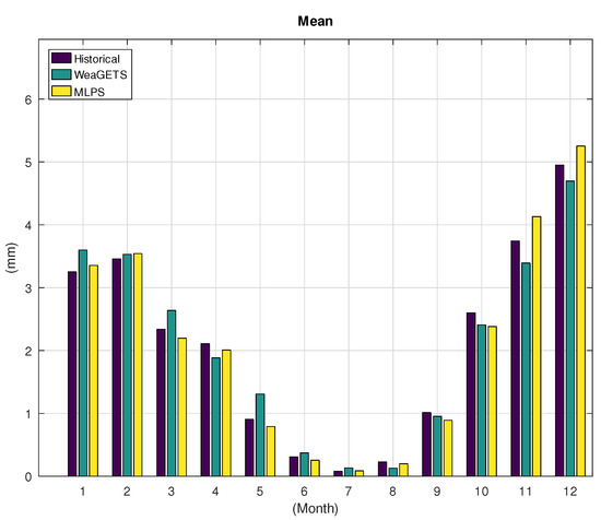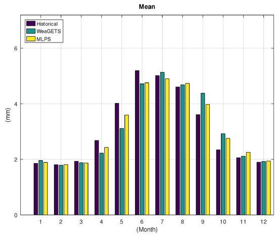 The results of the two case studies suggest that the MLPS performance regarding the statistical properties related to short-term memory was equivalent to the performance of an established stochastic model. WeaGETS did not correctly estimate the frequency of the more extreme events in Figure 5, Figure 7, Figure 12, and Figure 14. This is because of the configuration used in WeaGETS (see Section 2.2), which was selected intentionally to demonstrate the long-term persistence effect and its importance in time series analysis. This is also the reason for the underestimated annual standard deviation of WeaGETS time series (see first row of Table 1 and Table 2). According to climacograms [42] in Figure 8 and Figure 15, this underestimation is more profound at higher scales.