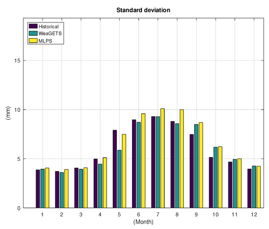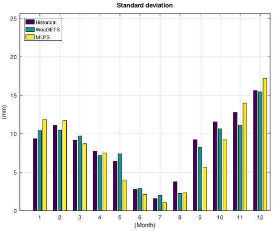 Monthly standard deviation of the synthetic (WeaGETS and MLPS) and historical time series of the Gibraltar weather station.