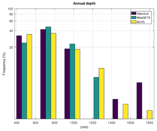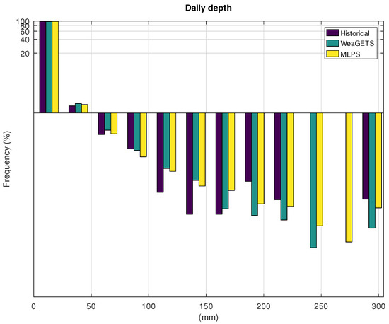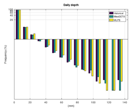 Figure 4 displays the histogram of the daily time series of the synthetic and historical values. To properly interpret this plot, it should be kept in mind that the longer the bar above the horizontal axis, the higher the frequency, whereas the longer the bar below the horizontal axis, the lower the frequency. For example, the long bars at depths greater than 100 mm correspond to frequency values very close to 0 (no bar is plotted for the values that are equal to 0). According to this figure, both models performed very well.
