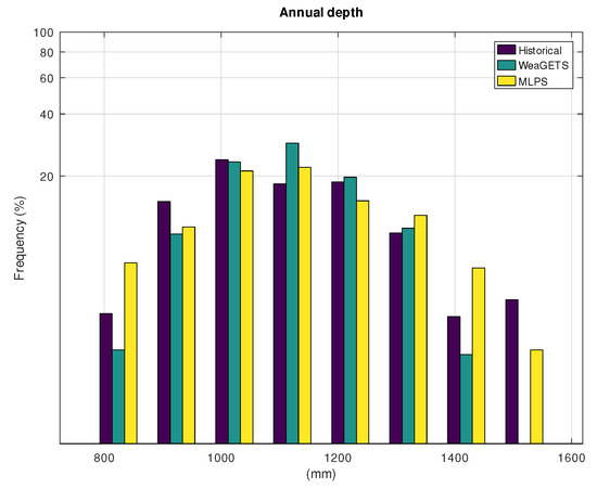 Figure 5 displays the histogram of the annual (aggregated from daily time step with plain summation) synthetic and historical time series.