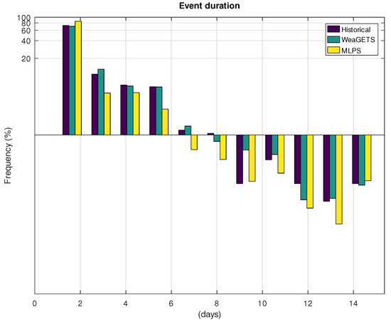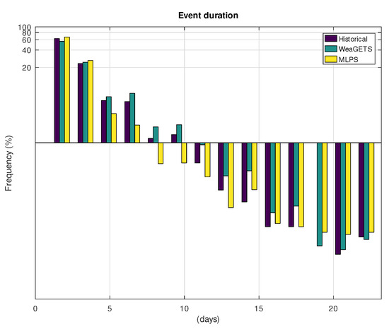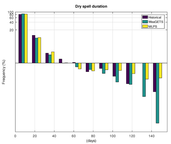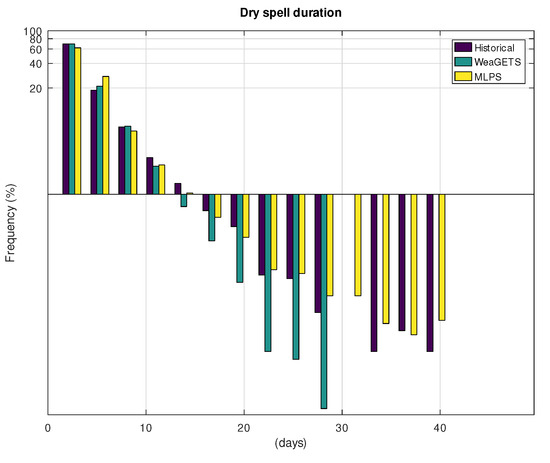 Figure 13 displays the histogram of the rainfall events’ duration. According to this figure, both models performed relatively well. Figure 14 displays the histogram of the duration of the dry spells. According to this figure, WeaGETS performs very well for the low and medium values of duration. However, it underestimates the frequency of the higher duration values. MLPS appears to slightly overestimate the frequency of the higher duration values.