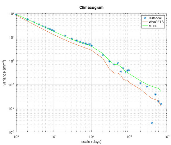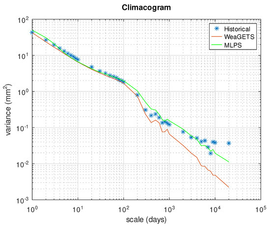 Figure 15 displays the climacogram of the Gibraltar time series. MLPS fits very well with the marks of the historical time series, except at greater scales.