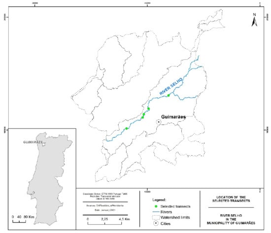 Location of River Selho in the Guimarães Municipality and selected transects for RHS application.