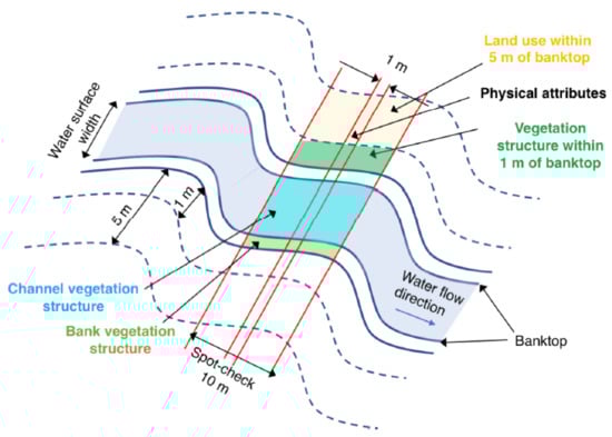The RHS evaluates the physical structure of watercourses based on a standard 500 m sampling transect [,], which requires extensive fieldwork to identify visually predefined features and to draft survey forms. The RHS offers a semi-objective method developed and tested in scenarios different from those that normally characterize Portuguese river ecosystems []. Therefore, adaptations of the RHS form and methodology were required in order to fulfil some WFD requirements not covered by the original methodology. The RHS form is divided into 18 sections [] and includes the characteristics of fluvial channel, land use, and adjacent river corridor attributes, such as geology, slope, or distance from the source []. A field survey obtains the data pertaining to both in-stream and bank features, collected in 10 spot-checks, with a 50 m distance between each (Figure 2).