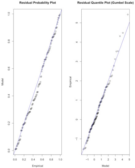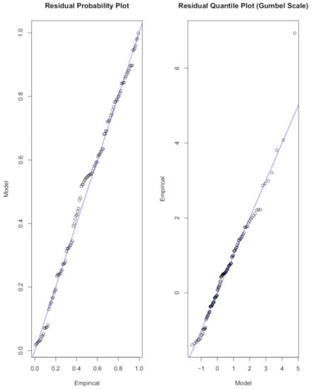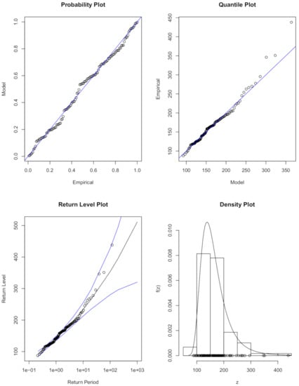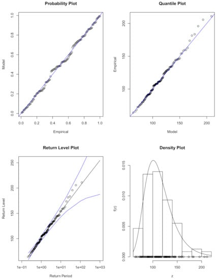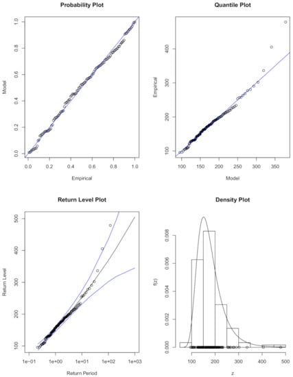 Alam et al. [] stated that graphical test is one of the most simple powerful techniques for selecting the best-fit model. To check if the time-dependent GEVD fit well to the monthly rainfall data, the following graphical tests were used.