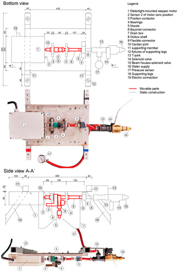 The design concept of the new simulator includes the option of adding a hollow shaft for water intake mounted in bearings to the water supply, to which the nozzle, housing a solenoid valve and a pressure sensor, is connected. The connection with the stepper motor is supplied by a Cardan joint, which allows small clearances that occur during field work, transport, and other handling operations. The stepper motor is fitted with a zero-position sensor from which the inclination angle of the nozzle can be read. At the same time, it is possible to determine in which phase of the nozzle rotation the solenoid valve should be open or shut off.