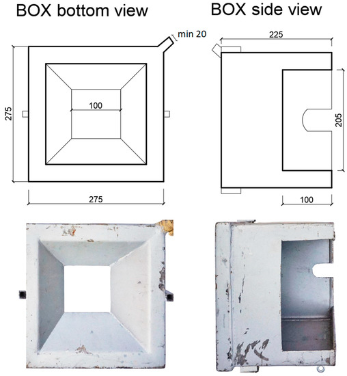 The purpose of this box is to delimit the required size of the sprinkled area and eliminate unwanted overspray outside the monitored area. Excess water is drained from the box back into the water tanks. The delimitation of the sprinkled area not only serves to save water, but also increases the sprinkler operator’s comfort. The drain box has a square plan of 27.5 × 27.5 cm and is fitted with 22.5 cm high walls on the outside. The internal part is a regular truncated quadrilateral pyramid with a base with an edge of 21.5 cm, a height 6.5 cm, and an angle of 140°. The distance from nozzle 5 is adjustable, thus allowing restricting the sprinkled area. The water is drained through a hole with a diameter of 20 mm back into the tank. In the case of a smaller diameter, the water drainage capacity is exceeded at low intensities, and the drain box overflows. The drainage box can be made from steel or from transparent plastic to control water in the box.