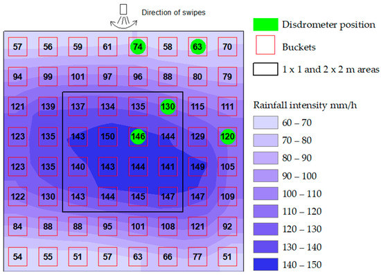 The functionality and usability of the device were tested in terms of rainfall uniformity and Ke of the raindrops. The resulting parameters of the nozzles and the generated rainfall characteristics are presented in Table 1. In total, six flat nozzles and one square nozzle presented a CU higher than 70%. In Figure 3, an example of rainfall spatial distribution (nozzle Veejet 80100) is shown. The green spots indicate where the disdrometer was placed.