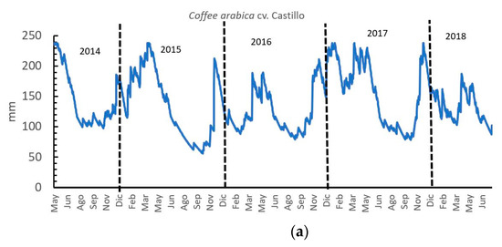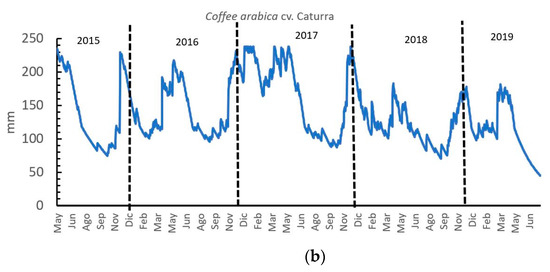 In this study, the coffee cherry yield was taken during a monthly harvest from January to December from 2015 to 2018, with a higher proportion of the harvest from April to June. From a coffee physiology perspective, eight months pass from flowering to harvest [28], for this reason, the ETact was calculated from May to December of the harvest year because the flowers that open in May correspond to harvestable coffee in January, the flowers from June result in the coffee harvest in February, and so on.