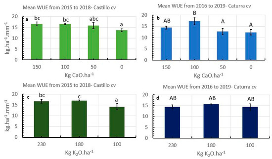 Influence of the calcium and potassium fertilization on water use efficiency in two coffee varieties, Castillo cv (a,c) and Caturra cv (b,d). Different letters indicate statistically significant differences in LSD test p < 0.05.