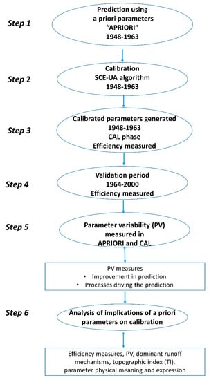 Given the regional aspect of the study, the criterion of homogeneity in the hydrologic response was considered through the use of homogeneous regions in eastern US [31]. The idea behind working in homogeneous regions was to allow for model efficiency comparison between the regions and within the same region. The criteria of homogeneity facilitated the study of a priori parameter effect on model performance and on calibration. The analysis used the regionalization of [32]. Within each region, each MOPEX catchment had a set of a priori parameters that was used to make a first prediction. This first prediction used the same record length as that used to conduct the model calibration (1948–1963). This prediction was denoted as the APRIORI phase (step 1 in Figure 2). The model was then calibrated using the SCE-UA algorithm (record length 1948–1963). The a priori parameters were the starting values to conduct the calibration (step 2 in Figure 2). This phase was denoted as CAL and generated a set of calibrated parameters (step 3 in Figure 2). CAL and APRIORI both used the same record length for consistency. Each catchment of the same region had a set of a priori parameters and a set of calibrated parameters. The model efficiency was measured in each region using the a priori and calibrated parameters applied on the same MOPEX data during the calibration period (1948–1963) and the validation period (1964–2000) (please check Section 3.2.2 for more about calibration, validation, and model efficiency metrics) (step 4 in Figure 2).