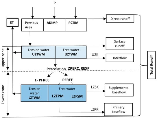 The excess from the tension water capacity of the upper zone (UZTWM) becomes the excess rainfall, and the excess from above the free water capacity (UZFWM) generates the surface runoff. At saturation of the upper zone storages, the runoff rate is influenced by deficiencies in the lower zone reservoirs, the tension water, LZTWM, and the free water, LZFSM and LZFPM, capacities. The runoff is generated at each free water reservoir depending on the depletion coefficients, namely, the UZK coefficient in the upper zone and LZSK and LZPK in the lower zone (see Figure 3). The percolation rate into the lower zone is a nonlinear function of the deficiencies of the lower and upper reservoirs and includes two parameters: the maximum rate of percolation, ZPERC, and an exponent value, REXP [24]. The water from the deep percolation divides into three storages. The PFREE parameter determines the fractional split between the tension and free water storages. The parameters not estimated by the a priori expressions are ADIMP and PCTIM because they are not soil-derived [24].
