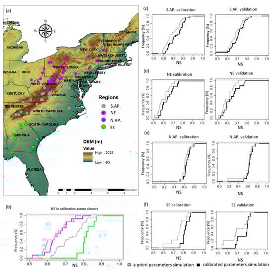 (a) Catchments regionalization according to Sawicz et al. (2011) and DEM, (b) comparison of Nash–Sutcliffe coefficients (NS) between regions in the calibration period using the cumulative distribution functions (CDFs), (c) CDFs of NS coefficients using a priori and calibrated parameters in S.AP., (d) in NE, (e) in N.AP. and (f) in SE. NE stands for north east, N.AP. stands for North Appalachian, S.AP. stands for south Appalachian, SE stands for south east. The NS coefficient was calculated at each study station using the observed and simulated discharges.