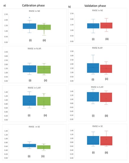 RMSE results calculated from predicted and simulated discharges using a priori and calibrated parameters in calibration (panel (a) of the Figure) and validation (panel (b) of the Figure). In panels (a,b), the boxplots (i) used the a priori parameters and the boxplot (ii) used the calibrated parameters. NE stands for north east, N.AP. stands for North Appalachian, S.AP. stands for south Appalachian, SE stands for south east.