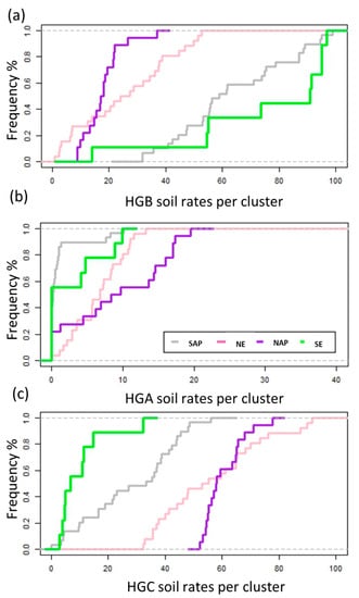 In NE and N.AP., the soils are poorly drained and have a steep topography, whereas, in SE, the catchments have well-drained soils and are located at lower elevations (Figure 4a). In Figure 6, large differences were observed in the spatial patterns of the soil hydrologic groups. The CDFs of HGB showed that it was predominant in SE and S.AP. (Figure 6a). The proportion of HGA soils was small across regions (soils with high infiltration, Wood et al. 1984 [30]), except in N.AP. (Figure 6b). Meanwhile, HGC soils (slow infiltration rate) were prominent in N.AP. and NE (Figure 6c).