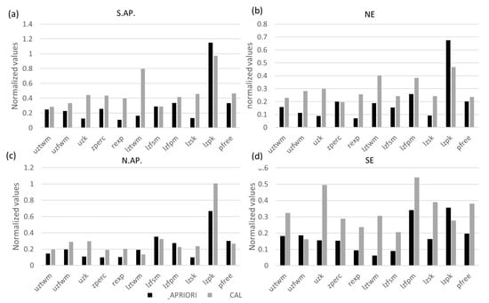 The value of each parameter varied among catchments of the same region. The variability of each a priori parameter among catchments of the same region was quantified. After calibration, the variability of the same parameter was also quantified. The level of variability of the model parameters was compared between the APRIORI and CAL phases (step 5 in Figure 2). If the variability of one specific parameter from APRIORI to CAL increased in one region, then the calibration better mimicked the variability of that parameter value among the catchments of the same region. The parameter was then considered among the parameters most influential on the prediction. The criteria of increased variability was previously used in [23,26]. The physical meaning of each parameter having an increase in variability from APRIORI to CAL tells about the hydrological processes mostly driving the runoff prediction. If the parameter variability is stable between APRIORI to CAL, then the calibrated parameters barely changed from the a priori values after calibration.
