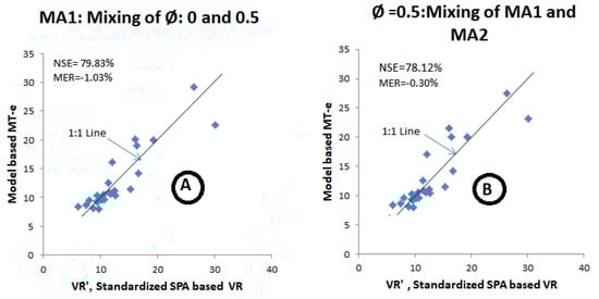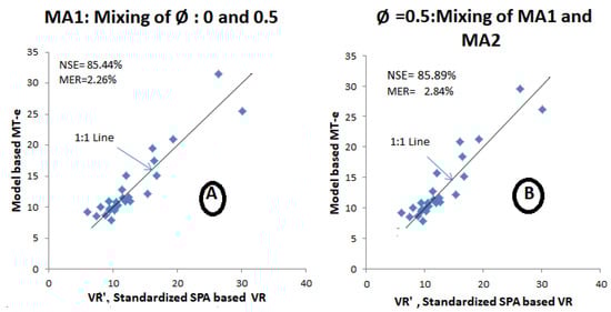 With the use of Φ = 0.5 on the MA1 sequences, major discrepancies were noted in the rivers lying in Prairies and Western Ontario (#1 to #6) in which ρm1 was ≥0.5, whereas the rivers from #6 to #25 tended to show reasonable correspondence. It can, thus, be conjectured that the same value of Φ is not applicable uniformly in all the rivers. Therefore, the following two groups of rivers were formed: group 1 was river #1 to #6 and group 2 was river #6 to #25. The discrepancy in group 1 was ameliorated with the use of Φ = 0, while retaining Φ = 0.5 for the rivers in group 2. Likewise with Φ = 0.5 on the MA2 sequences in the group 1 rivers, but Φ = 0.5 on the MA1 sequences in the group 2 rivers tended to improve the matching. This mooted the idea of mixing Φ’s (0 or 0.5) on the MA1 sequences (named as combination-A) or mixing the MA1 and MA2 sequences with Φ = 0.5 (named as combination-B). Based on the use of differential values of Φ on the MA1 sequences in combination-A, the resultant MT-e values are arranged in column 10 (Table 4). The combination-A-based values of MT-e compared satisfactorily with VR’ as shown in Figure 2A (MER ≈ −1% and NSE ≈ 80%). Likewise, in combination-B the MT-e values with differential MA (MA1 or MA2 sequences) with a uniform value of Φ = 0.5 are arranged in column 13 (Table 4). The combination-B resulted in NSE = 78% with negligible overestimation of 1.5% (Figure 2B).