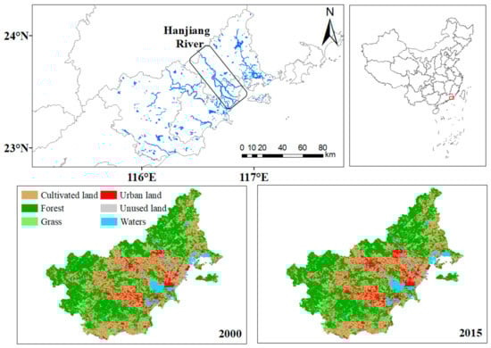 The coastal area of Eastern Guangdong covers three cities. From north to south lies Shantou, Chaozhou, and Jieyang (Figure 1). In addition, Figure 1 also shows the water system map and land use map of the coastal area in Eastern Guangdong. During the period from 2000 to 2015, the area of cultivated land in the coastal areas of Eastern Guangdong decreased, while the area of urban land increased. The area is approximately rectangular in shape, connecting the urban agglomeration of the Haixi Economic Zone to the east and the Guangdong, Hong Kong, and Macao Great Bay Area in the west. The urban agglomeration is bordered by Meizhou in the north and the South China Sea in the south. Economic, trade, and agricultural activities are very active in this region. Conducting research based on administrative areas is favorable to the collection of statistical data and the adjustment and implementation of relevant ecological protection measures. The basic natural and social conditions are shown in Table 1.
