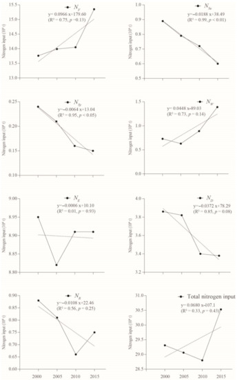 Regional nitrogen budget refers to nitrogen input, output and nitrogen surplus. The estimation of total nitrogen input refers to the sum of the agricultural related nitrogen and waste water nitrogen, while the nitrogen output means the total amount of nitrogen crop harvest and water output. Correspondingly, the nitrogen surplus indicates the difference between input and output. The nitrogen budget used mainly refers to the research results of Xie et al. [5] and Meng et al. [21]. The nitrogen budget equations are mainly as follows: