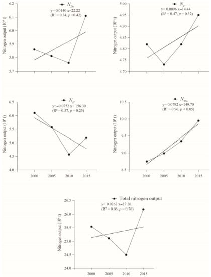 According to Figure 3, the total output nitrogen of the coastal Eastern Guangdong varied between 24.50 × 104– 26.18 × 104 t. The decrease of total nitrogen output from 2000 to 2010 was mainly caused by the decrease of NH, especially the decrease of rice yield. Rice yield decreased from 173.53 × 104 t in 2000 to 99.30 × 104 t in 2010. The total output of nitrogen showed an upward trend from 2010 to 2015, mainly caused by NH and NDe. During 2000–2015, the increase of nitrogen output led to a higher NDe. Meanwhile, due to the development of urbanization, the demand for vegetables increased, leading to the increase of vegetable output from 362.79 × 104 t in 2010 to 446.25 × 104 t in 2015, which cause the increase in NH. From the contribution rate of different nitrogen output sources, the Water Output Nitrogen was the main contributor, accounting for around 1/3 of the nitrogen output. The Denitrifying Nitrogen and Crop Harvest Taken Nitrogen made similar contribution to the nitrogen output, while the Volatile Nitrogen was the weakest contributor. The coastal Eastern Guangdong lies in the subtropical monsoon climate zone, with large annual precipitation, favorable of the nitrogen output via bleaching and eluviation of the cultivated land. As a result, a large amount of nitrogen lost through runoff (surface runoff and underground runoff) and injected into the ocean. The amount of Water Output Nitrogen shows an upward trend among various output nitrogen sources in coastal Eastern Guangdong, which may cause water pollution and even eutrophication.