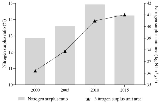 About 12.87%–14.92% of the nitrogen input through various forms will eventually remain in the region. The nitrogen surplus ratio showed a trend of first rising and then decreasing, while the nitrogen surplus unit area showed an obvious upward trend, increasing from 36.21 kg N ha−1 yr−1 in 2000 to 41.01 kg N ha−1 yr−1 in 2015. Considering that the input of nitrogen is mainly related to agricultural activities, the input of fertilizer nitrogen is increasing in the research period. The output of nitrogen is mainly through water body and was growing in the corresponding period. This shows that the interference of human activities continuously intensify the nitrogen flux of the study region.