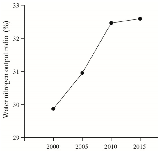 The nitrogen output from the water body is the main method of nitrogen output. The nitrogen discharged from agriculture, industry, humans, and livestock is absorbed into the water body in the form of leaching and runoff, and then exported into the sea. From 2000 to 2015, around one third of the nitrogen was lost through the water body in coastal Eastern Guangdong. The water nitrogen output rate of coastal Eastern Guangdong increased from 29.87% in 2000 to 32.59% in 2015 (Figure 5), with an average value of 31.47%. The proportion obtained is similar to the adjacent regions, such as 28.28% in Zhanjiang Bay area [21], 38.61% in Beijiang River Basin [27], and 26.95% in Pearl River Delta [5], and the nitrogen output from water body is also the largest nitrogen output source in these regions.