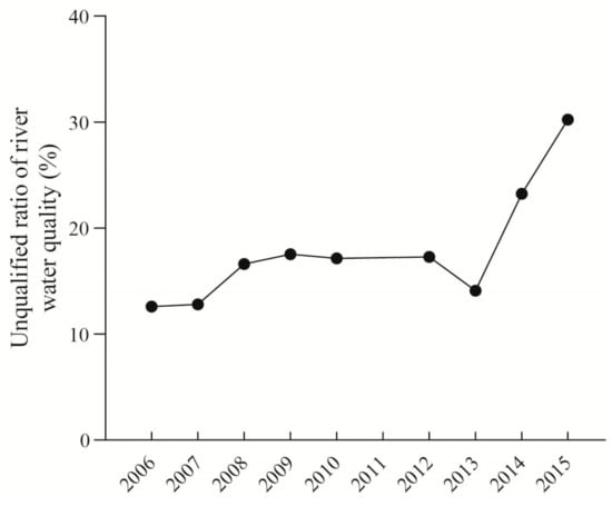 Unqualified ratio of river water quality of the coastal Eastern Guangdong in 2006–2015.