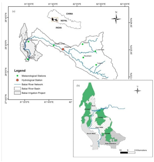 The Babai River Basin (BRB) lies in the western part of Nepal (Figure 1a). The area of this basin is around 3250 km2. It lies within 81°14′ E to 82°38′ E longitude and 27°56′ N to 28°32′ N latitude. The Babai River is a tributary of the Karnali River (the third biggest river of Nepal). The BRB lies partially in the Middle Mountainous Zone (MMZ). The elevation of the basin extends between 147 to 2880 m from the mean sea level. It lies in a subtropical region. The average annual rainfall in the basin, based on data from 1975 to 2005 observed at seven climatological stations, is 1468 mm. About 83% of the total rainfall occurs from June to September. The only hydrological station in the Babai River is located at Chepang and has a catchment area of 2570 km2. The annual mean flow at Chepang is 86 m3/s. The maximum runoff at this station is 257 m3/s, which occurs in August, and the minimum runoff is 9.9 m3/s, which occurs in April. From the Chepang station, the river passes through the Bardiya National Park and exits in the plains in Bardaghat. The headwork of the Babai Irrigation Project (BIP) is located in Bardaghat. The average maximum and minimum temperatures of the area are 31 and 18 °C, as observed at the Rani Jaruwa station. The average annual rainfall in the BIP area is around 1130 mm whereas the basin’s average rainfall is 1468 mm. The basin is dominated by forest (36.2%), followed by agricultural land (28.9%), and the smallest portion is occupied by built-up area (2.2%). The geographical and basic information about the meteorological and hydrological stations is presented in Figure 1 and Table 1.