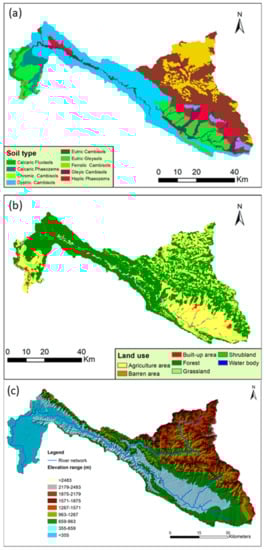 Soil data and all the required information related to soil properties were obtained from the soil and terrain database (SOTER http://www.isric.org/data/soil-and-terrain-database-Nepal; accessed on 13 May 2021). A 30 m resolution land-use map was obtained from the International Centre of Integrated Mountain Development (ICIMOD). The map was developed in 2010 using Landsat imagery []. Figure 2 shows the soil types and land-use types in the Babai River Basin.