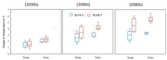 Future temperature and rainfall of the BRB were obtained by the ensemble of downscaled and bias-corrected data from the selected GCMs. Table 5 shows the changes in maximum and minimum temperature at the three stations—Tulsipur, Salyan, and R J Nursery—under RCP 4.5 and 8.5 in near, middle, and far future periods. Under RCP 4.5, the change in average annual maximum temperature at the Tulsipur station in the 2030s, 2060s, and 2080s is around 1.45, 2.27, and 2.93 °C respectively. Similarly, under RCP 8.5, the change in average annual maximum temperature at the Tulsipur station in the 2030s, 2060s, and 2080s is around 1.51, 2.99, and 4.66 °C respectively. However, the change in minimum temperature at this station under RCP 4.5 in the 2030s, 2060s, and 2080s is around 2.06, 2.84, and 3.27 °C respectively. The minimum temperature under RCP 8.5 for the same station in the 2030s, 2060s, and 2080s is around 2.25, 3.81, and 5.42 °C respectively. The changes in annual average temperature in the other two stations are also similar under both scenarios. This indicates that temperature under RCP 8.5 is higher than under 4.5 by more than 1.5°C at the end of the century. Past research conducted by Mishra et al. at the Bheri [] and Koshi rivers [] also showed that temperature in the mountainous areas of Nepal will increase by around 4 degrees in the future. The results of the current study also indicate that the rate of increment of minimum temperature is one degree more than that of maximum temperature.