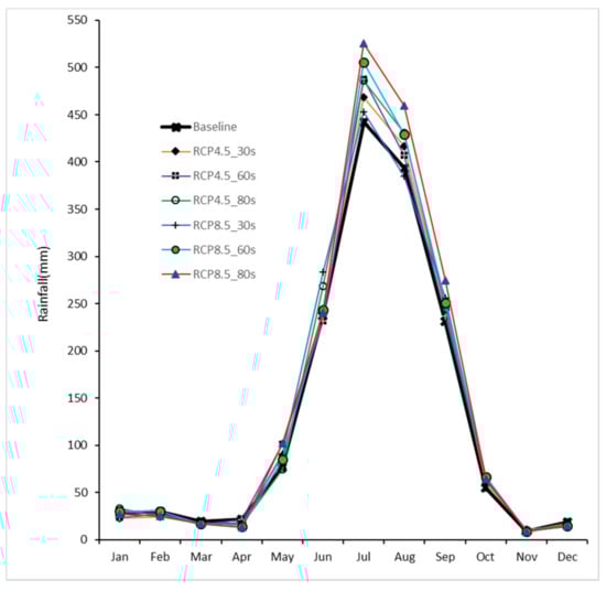 Comparison of monthly rainfall between observed (1975–2005) and projected climate using the ensemble of three GCMs.